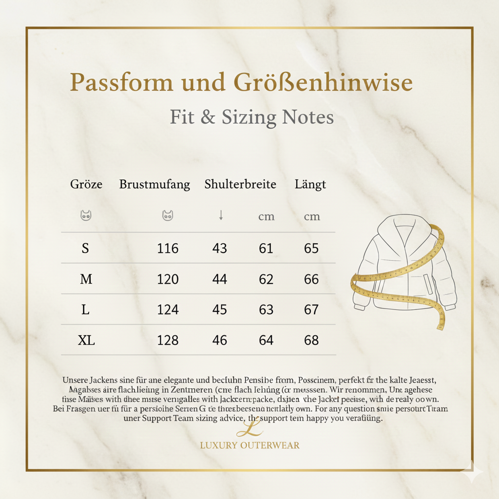 Unsere Jacken sind für eine elegante und bequeme Passform konzipiert, perfekt für die kalte Jahreszeit. Die Maße sind flachliegend in Zentimetern (cm) gemessen. Wir empfehlen, diese Maße mit denen eines vergleichbaren Mantels, den Sie bereits besitzen, zu vergleichen.