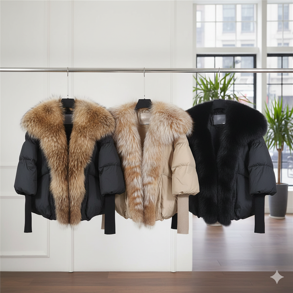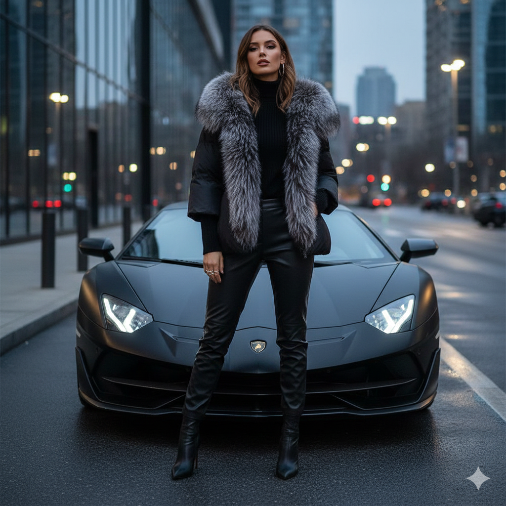 Questa variante del piumino Sophia combina la struttura nera con il morbido pellicciotto grigio, creando un contrasto elegante e luminoso. Caldo e confortevole, è ideale per chi desidera un capo chic ma versatile, facile da abbinare sia a look casual che più ricercati.